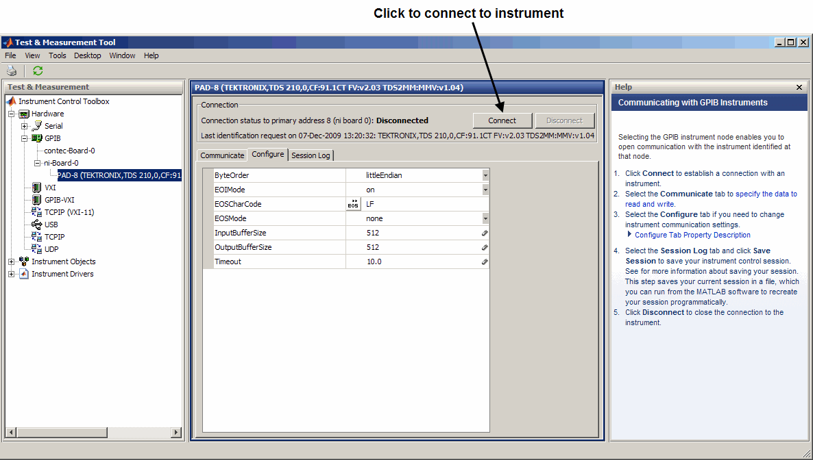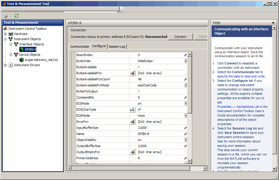 Инструмент Test & Measurement Tool автоматически создает объекты интерфейса при открытии канала связи с прибором нажатием кнопки Communication Status. Чтобы явно создать и настроить объект интерфейса, выполните следующие действия.