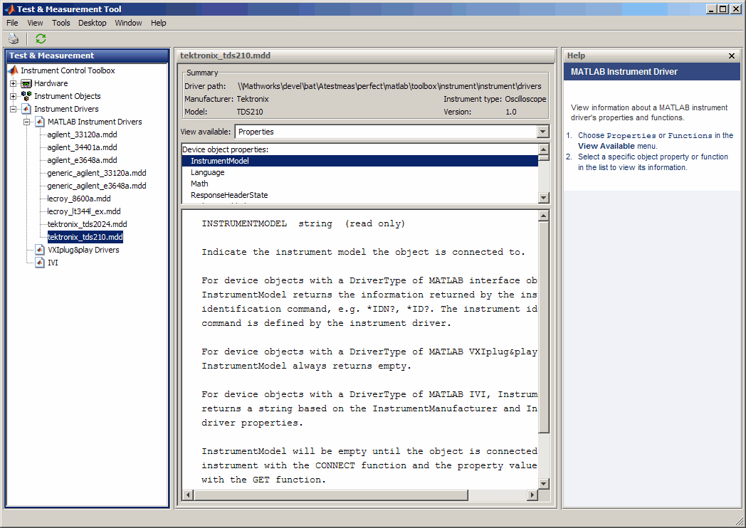 Когда программа Test & Measurement Tool сканирует драйверы, она делает их доступными в качестве узлов в узле типа драйвера. Разверните окно MATLAB software Instrument Drivers для отображения установленных драйверов. Выберите один из них для просмотра сведений о водителе.