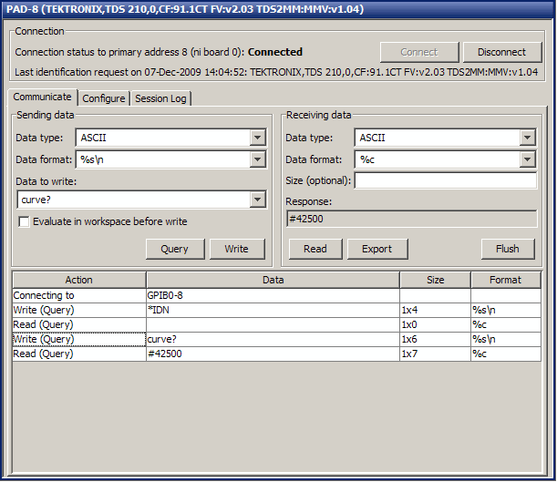 Разверните окно ni-Board-0 и выберите прибор по основному адресу 4: PAD-8 (TEKTRONIX,TDS 210...). Правая панель изменяется на панель управления, используемую для записи и считывания данных в этот инструмент и из него.