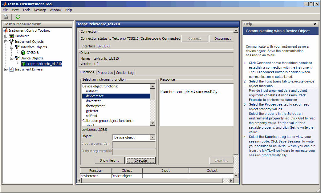 На следующем рисунке инструмент тестирования и измерения сбрасывает осциллограф TDS 210 путем вызова devicereset функции привода прибора. Общаясь таким образом, вам не нужно знать, что такое фактическая команда сброса осциллографа.
