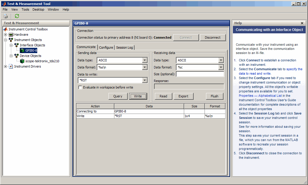 Использование объекта интерфейса. При взаимодействии с прибором с помощью объекта интерфейса данные отправляются прибору в виде необработанных команд прибора. На следующем рисунке инструмент тестирования и измерения посылает *RST строка в осциллограф TDS 210 через объект интерфейса. *RST - команда сброса осциллографа.