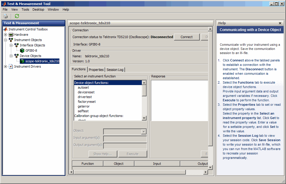 Независимо от того, создаются ли объекты инструмента автоматически, создаются ли они в диалоговом окне Создание нового объекта (New Object Creation) или в окне Команда MATLAB (MATLAB Command), Инструмент тестирования и измерения (Test & Measurement Tool) позволяет задать свойства этих объектов. Чтобы изменить свойства объекта в инструменте испытаний и измерений, выполните следующие действия.