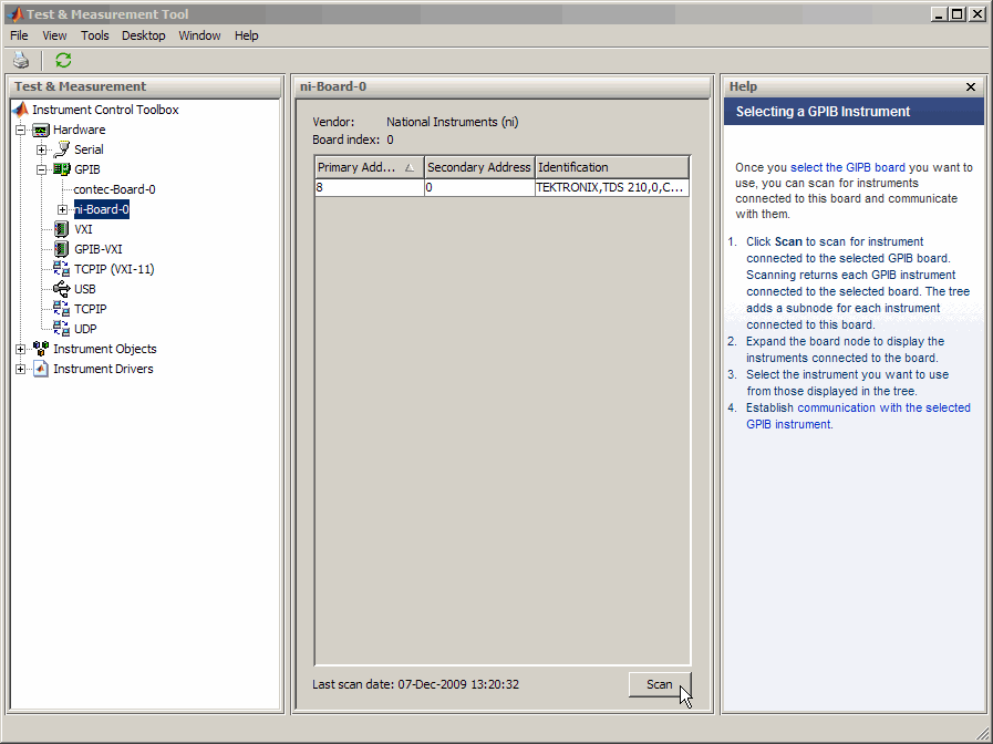 Правая панель изменится на список GPIB Instruments. Нажмите кнопку Scan, чтобы узнать, какие приборы подключены к этой плате. На следующем рисунке показан результат сканирования системы с TDS 210 Tektronix, подключенной по первичному адресу 8ˋ.