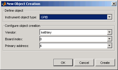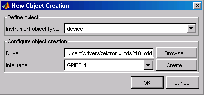 Щелкните Новый объект (New Object), чтобы открыть диалоговое окно Создание нового объекта (New Object Creation). В этом случае тип объекта Instrument уже установлен для device.