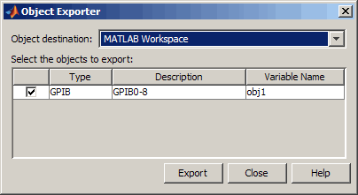 При открытии соединения с прибором инструмент тестирования и измерения автоматически создает объект прибора. Объект инструмента GPIB, созданный в этом примере, можно экспортировать следующим образом: