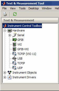 При отображении инструмента разверните (щелкните значок +) Instrument Control Toolbox узел в дереве. Затем разверните вкладку Hardware узел. Дерево теперь выглядит вот так.