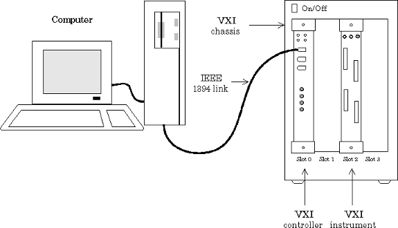 Интерфейс VXI связан с контроллером VXI, устанавливаемым в слот 0 корпуса VXI. Этот интерфейс вместе с другими соответствующими аппаратными средствами показан ниже.