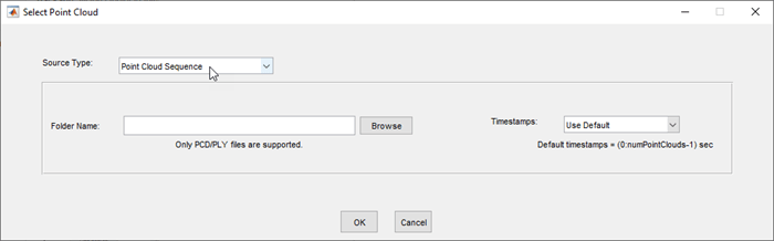 vision.labeler.loading.PointCloudSequenceSource создает интерфейс для загрузки сигнала из источника данных последовательности облаков точек в приложение Lidar Labeler. в диалоговом окне «Выбор облака точек» приложения, если для параметра «Тип источника» установлено значение Point Cloud Sequence, этот класс управляет параметрами в этом диалоговом окне.