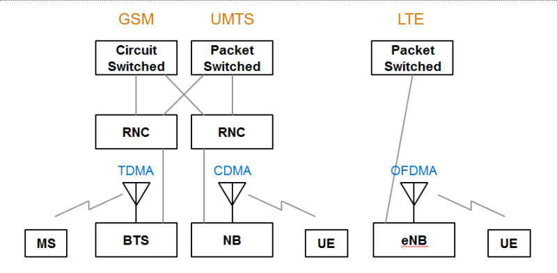 GSM и UMTS являются предшественниками радиоинтерфейса LTE и называются технологиями второго поколения (2G) и третьего поколения (3G) соответственно. GSM была разработана как сеть с коммутацией каналов, что означает, что услуги радиосвязи конфигурируются по запросу пользователя, и ресурсы остаются выделенными до завершения сетевым контроллером. Этот тип операций хорошо подходит для поддержки голосовых вызовов. В конечном счете, GSM был усовершенствован для поддержки услуг с низкой скоростью передачи данных с возможностью коммутации пакетов, но скорости передачи данных были ограничены радиоинтерфейсом GSM, множественным доступом с временным разделением каналов (TDMA). В TDMA каждый пользователь назначается конкретному каналу (полосе частот) и временному интервалу, который служит для ограничения пропускной способности, поскольку интервал между каналами составляет только 200 кГц.