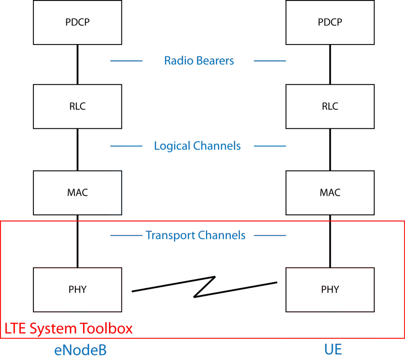 LTE Toolbox™ фокусируется на физическом уровне, который выделен красным цветом на предыдущем рисунке. Он также поддерживает взаимодействие с частями уровней RLC и MAC, которые выделены синим цветом. Основными особенностями физического уровня LTE являются модуляция OFDM, включающая в себя частотно-временную структуру блоков ресурсов, адаптивную модуляцию и кодирование, гибридный ARQ и MIMO.