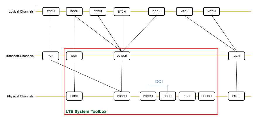 Данные нисходящей линии связи системы следуют за указанным отображением между логическими каналами, транспортными каналами и физическими каналами. Красный контур содержит функциональные возможности LTE Toolbox по нисходящей линии связи для физических каналов, транспортных каналов и управляющей информации.