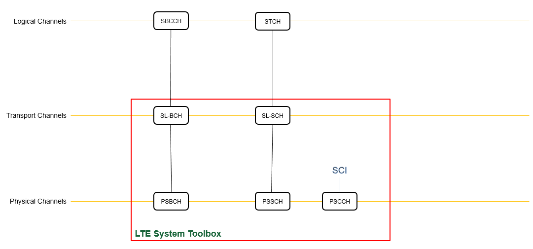Данные боковой линии связи системы следуют за указанным отображением между логическими каналами, транспортными каналами и физическими каналами. Красный контур содержит функциональные возможности боковой линии панели инструментов LTE для физических каналов, транспортных каналов и управляющей информации.