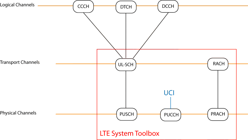 Данные восходящего канала системы следуют за указанным отображением между логическими каналами, транспортными каналами и физическими каналами. Красный контур содержит функциональные возможности восходящей линии связи LTE Toolbox для физических каналов, транспортных каналов и управляющей информации.