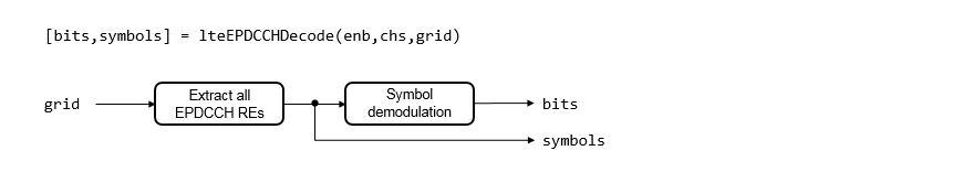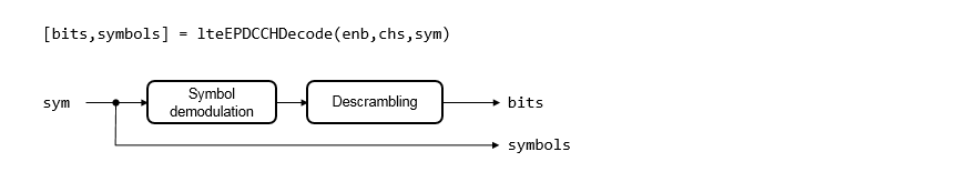 [ выполняет декодирование и выравнивание EPDCCH для одного сконфигурированного кандидата EPDCCH с заданной структурой настроек для всей ячейки, структурой конфигурации передачи EPDCCH, принятыми символами EPDCCH bits,symbols] = lteEPDCCHDecode(enb,chs,rxsym,hest,noiseest)rxsym, оценка канала hestи оценка шума noiseest. Выходные принятые символы EPDCCH выравниваются, и символ QPSK демодулируется и дескремблируется.