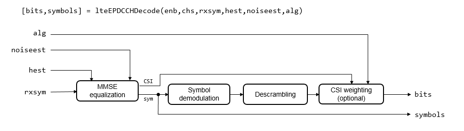 [ выполняет декодирование и выравнивание EPDCCH для одного сконфигурированного кандидата EPDCCH и обеспечивает управление взвешиванием выходных мягких битов информацией о состоянии канала (CSI), вычисленной на этапе выравнивания с использованием алгоритмической структуры конфигурации, bits,symbols] = lteEPDCCHDecode(enb,chs,rxsym,hest,noiseest,alg)alg.