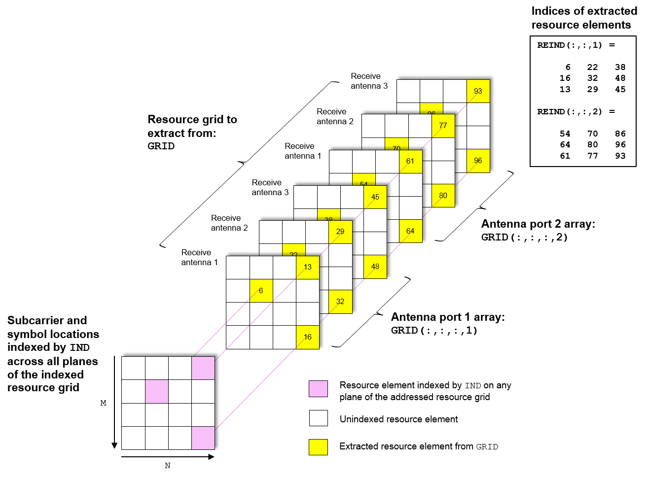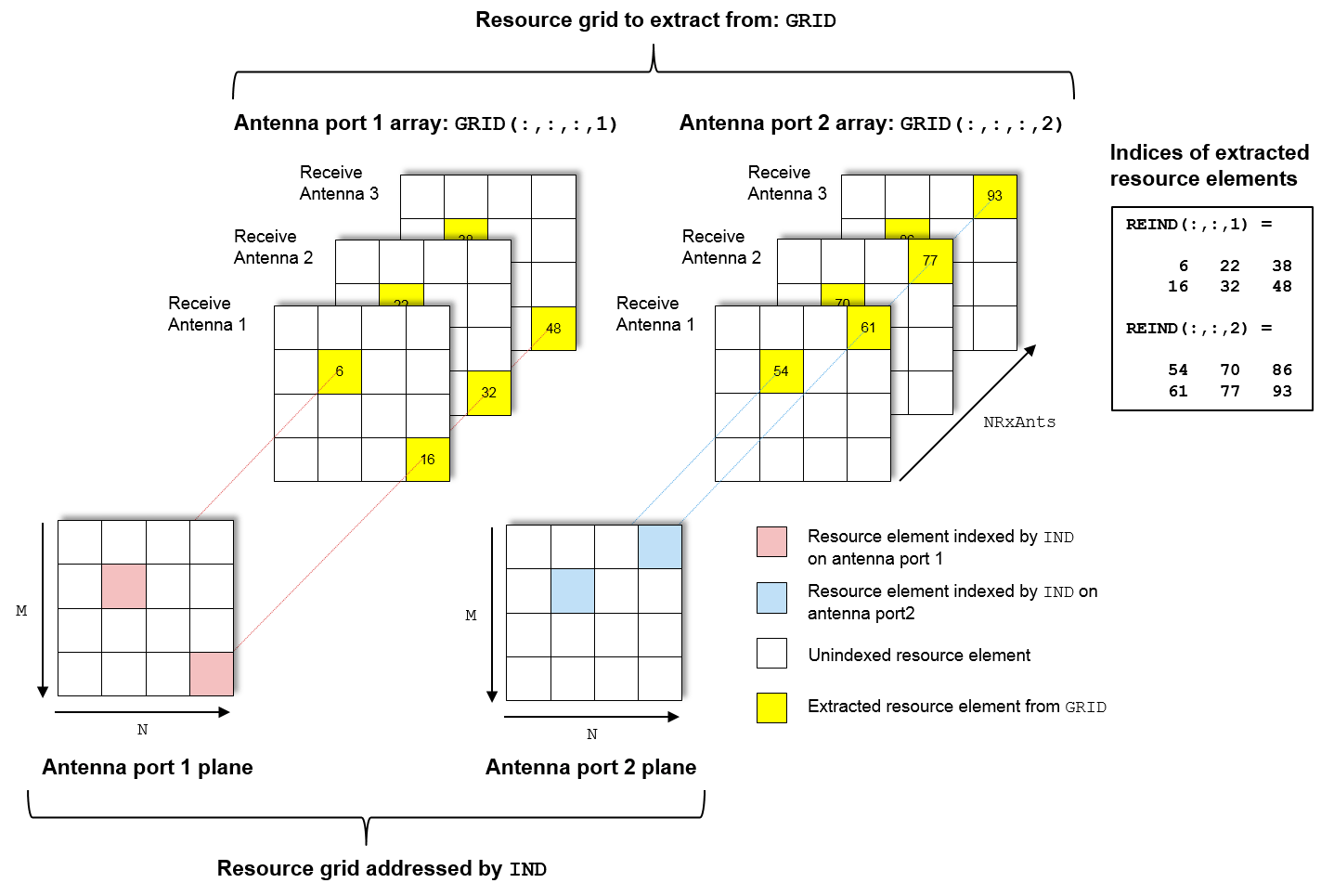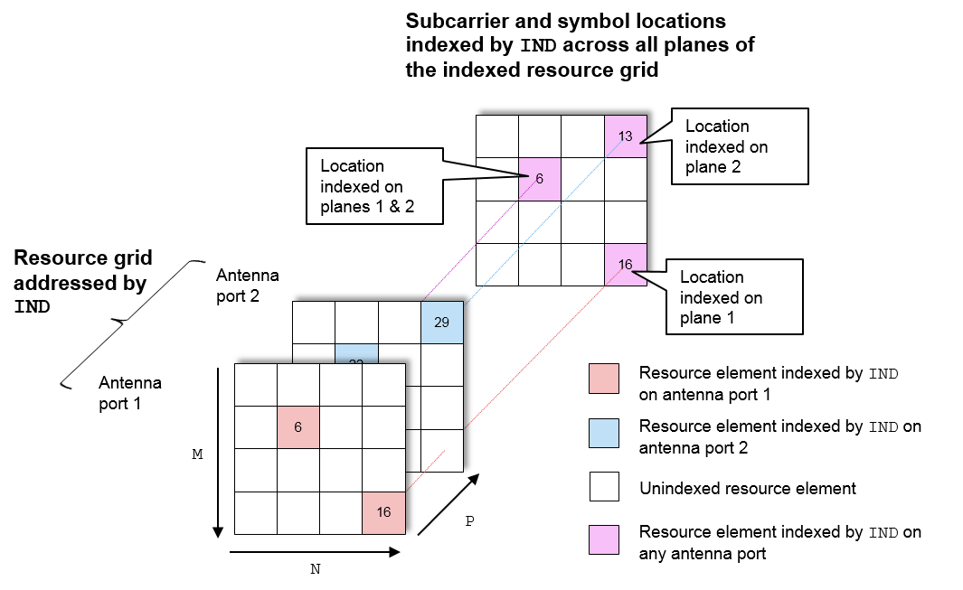 В LTE Toolbox™ формируют индексы для отображения последовательностей символов физического канала и сигнала в сетку ресурсов. Эти индексы формируются с использованием специфичных для канала или сигнала функций и адресных элементов ресурсов в массиве размером M-by-N-by-P. M - количество поднесущих, N - количество символов OFDM или SC-FDMA и P - количество плоскостей. На диаграмме показаны элементы ресурсов сетки ресурсов, к которым относятся индексы. ind. Индексы имеют форму линейного индексирования на основе 1. P = 2 - количество антенных портов.