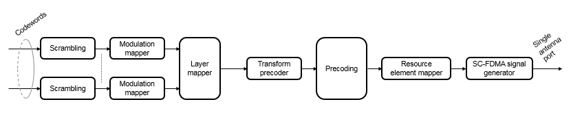 Обработка физического общего канала боковой линии связи (PSSCH) включает в себя PCSCH-специфическое скремблирование, QPSK или 16-QAM модуляцию и предварительное кодирование с преобразованием SC-FDMA. Обработка PSSCH выполняется в соответствии с этапами обработки, используемыми для PUSCH, с изменениями, определенными в TS 36.211, раздел 9.3.