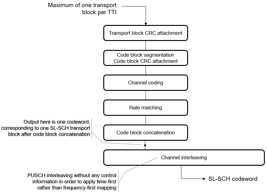 Обработка транспортного канала с общим боковым каналом (SL-SCH) включает в себя вычисление type-24A CRC, сегментацию кодовых блоков (включая вложение type-24B CRC, если присутствует), турбокодирование, согласование скорости с версией избыточности (RV), конкатенацию кодовых блоков и перемежение PUSCH. lteSLSCH генерирует это кодовое слово транспортного канала в соответствии с TS 36.212, раздел 5.4.2.