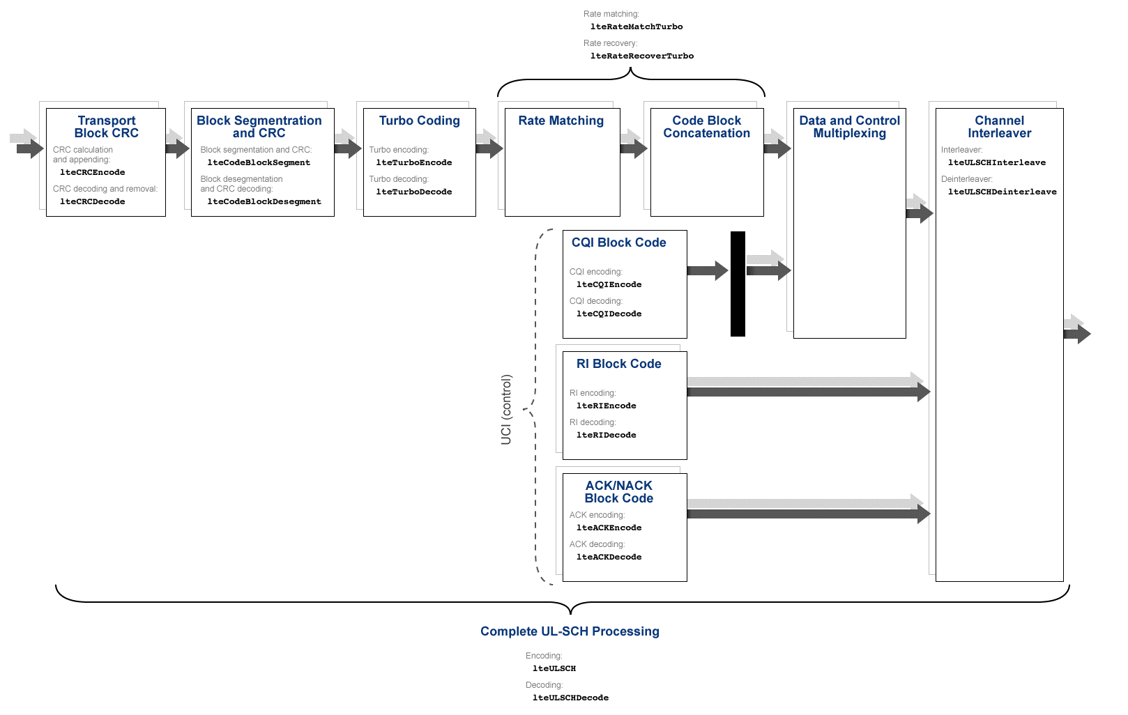 Полный процесс общего канала восходящей линии связи и связанные с ним функции UL-SCH низкого и среднего уровня показаны на следующей блок-схеме.