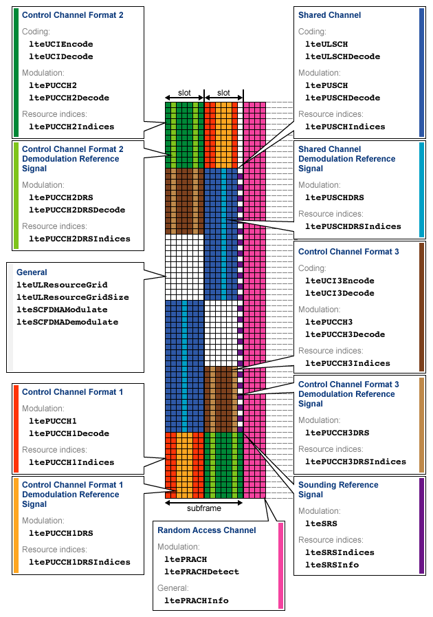 Физические каналы и сигналы восходящей линии связи, их связанные функции и их местоположения на сетке ресурсов показаны на следующем рисунке.