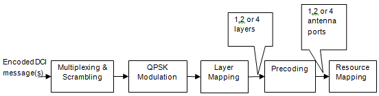 Кодированные сообщения DCI для каждого канала управления мультиплексируются, скремблируются и подвергаются модуляции QPSK, отображению уровня и предварительному кодированию, как показано на следующем рисунке.