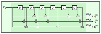 LTE использует кодер скорости ⅓ конечного бита с длиной ограничения k, равной 7. Это означает, что каждый третий бит выходного сигнала содержит полезную информацию, в то время как два других добавляют избыточность. Структура сверточного кодера показана на следующем рисунке.