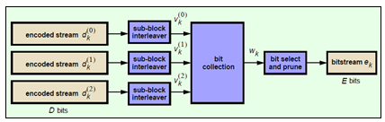 Блок согласования скорости создает выходной битовый поток с требуемой кодовой скоростью. Поскольку количество битов, доступных для передачи, зависит от доступных ресурсов, алгоритм согласования скорости способен создавать любую произвольную скорость. Три потока битов из сверточного кодера с концевыми битами перемежаются с последующим сбором битов для создания кольцевого буфера. Биты выбираются и отсекаются из буфера для создания выходного битового потока с требуемой кодовой скоростью. Процесс проиллюстрирован на следующем рисунке.