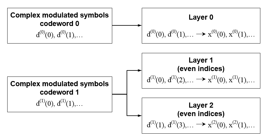 Комплексные символы отображаются на один, два или четыре уровня в зависимости от количества используемых передающих антенн. Комплексные модулированные входные символы, d (i), отображаются на v слоев, x (v − 1) (i).