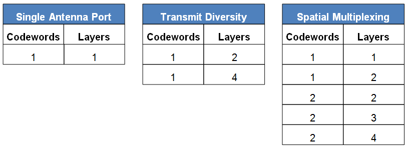 В качестве краткой ссылки на информацию, описанную в предыдущих разделах, допустимые количества кодовых слов и уровней для каждой схемы предварительного кодирования показаны в следующих таблицах.
