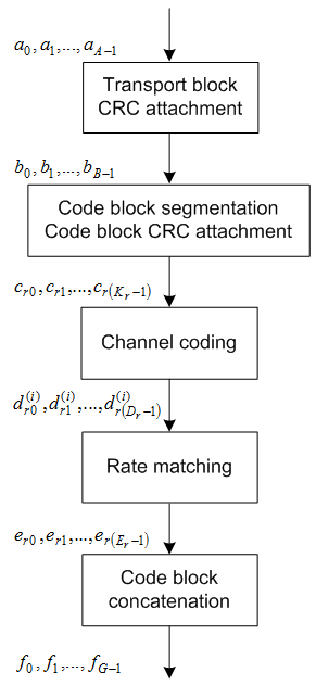 Для создания полезной нагрузки PDSCH транспортный блок длиной A, обозначенный как aA − 1, подвергается присоединению CRC транспортного блока, сегментации кодового блока и присоединению CRC кодового блока, кодированию канала, согласованию скорости и конкатенации кодового блока. Этапы кодирования проиллюстрированы на следующей блок-схеме.