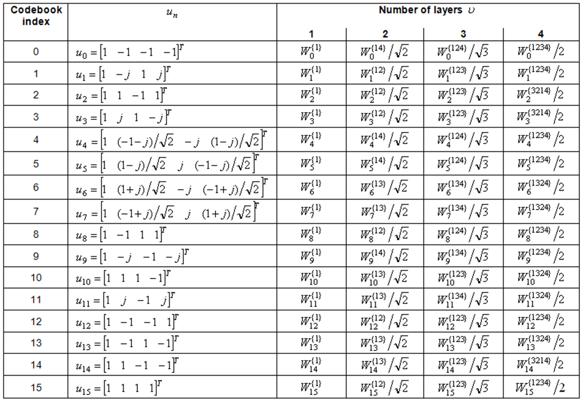Матрицы предварительного кодирования для антенных портов {0,1,2,3} приведены в следующей таблице.