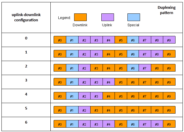 В режиме дуплексирования TDD одна полоса пропускания совместно используется восходящей линией связи и нисходящей линией связи, причем совместное использование выполняется путем выделения различных периодов времени восходящей линии связи и нисходящей линии связи. В LTE имеется 7 различных шаблонов коммутации восходящей линии связи по нисходящей линии связи, называемых конфигурациями восходящей линии связи по нисходящей линии связи от 0 до 6, как показано на следующем рисунке.