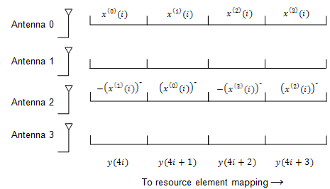 Предварительное кодирование двух антенных портов. Для предварительного кодирования используется схема Аламути, которая определяет взаимосвязь между входом и выходом, как показано в следующем уравнении.