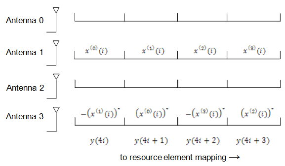 В этой схеме два последовательных символа передаются параллельно в двух периодах символов с использованием четырех антенн со следующим отображением, где символ звездочки (*) обозначает операцию комплексного сопряжения.