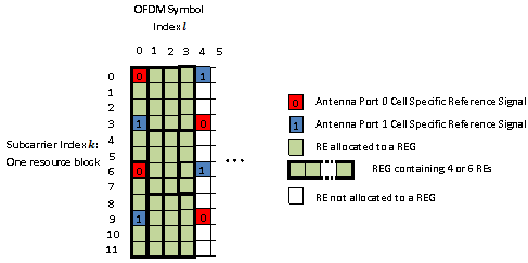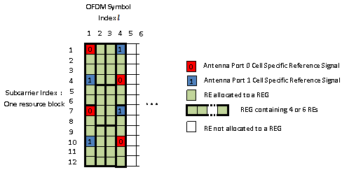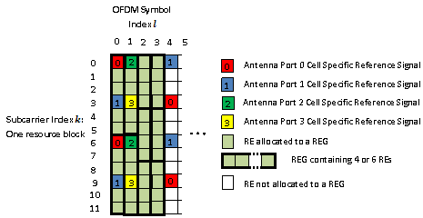 Все RE в пределах ресурсного блока в одном из первых четырех символов OFDM назначаются REG. Следовательно, на количество RE в пределах каждого REG и количество REG в пределах символа OFDM влияет количество конкретных для соты опорных сигналов, присутствующих на всех антенных портах.