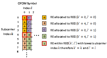 REG представлены индексной парой ′). k ′ является индексом поднесущей RE в пределах REG с самым низким индексом поднесущей k. Индекс l ′ является индексом символа OFDM REG (1). Эта пара индексов показана на следующем рисунке.