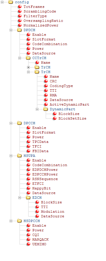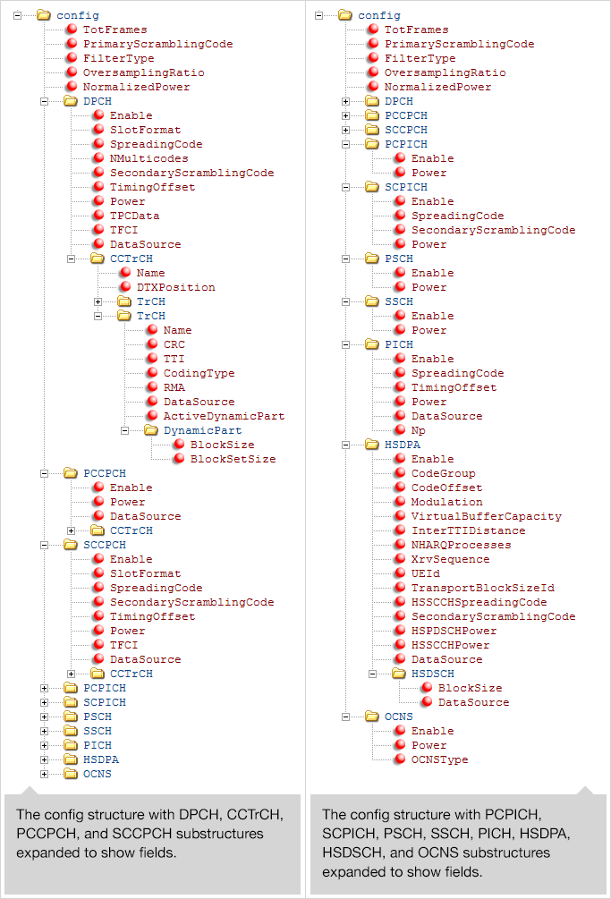 Для генерации сигналов UMTS нисходящей линии связи или восходящей линии связи необходимо определить свойства сигнала и каналы, которые необходимо включить в сигналы. Отдельные структуры конфигурации нисходящей линии связи и восходящей линии связи объединяют параметры, необходимые для инициализации и генерации формы сигнала для целевого направления линии связи.