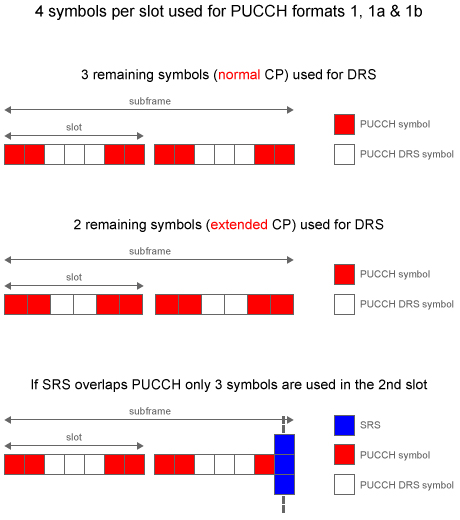Форматы 1, 1а и 1b PUCCH используют четыре символа SC-FDMA на слот. Если используется обычный циклический префикс, оставшиеся 3 символа, 2 для расширенного циклического префикса, используются для опорного сигнала демодуляции PUCCH (DRS). Если зондирующий опорный сигнал (SRS) перекрывает символы PUCCH, во втором слоте подкадра используются только три символа. Отображение символов показано на следующем рисунке.