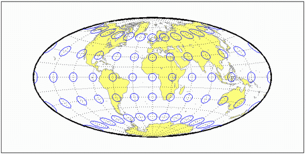 Эта реализация проекции Aitoff применима только для координат, связанных со сферой. Для проецирования координат, связанных с эллипсоидом, используйте projfwd или projinv функции, затем создайте projcrs вместо структуры проекции карты. Можно создать projcrs объект для проекции Aitoff с использованием кода полномочий ESRI 54043. Например: projcrs(54043,'Authority','ESRI').