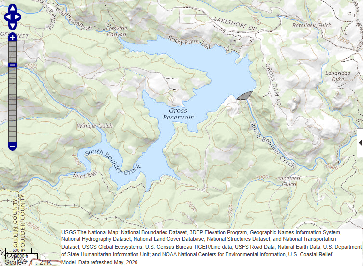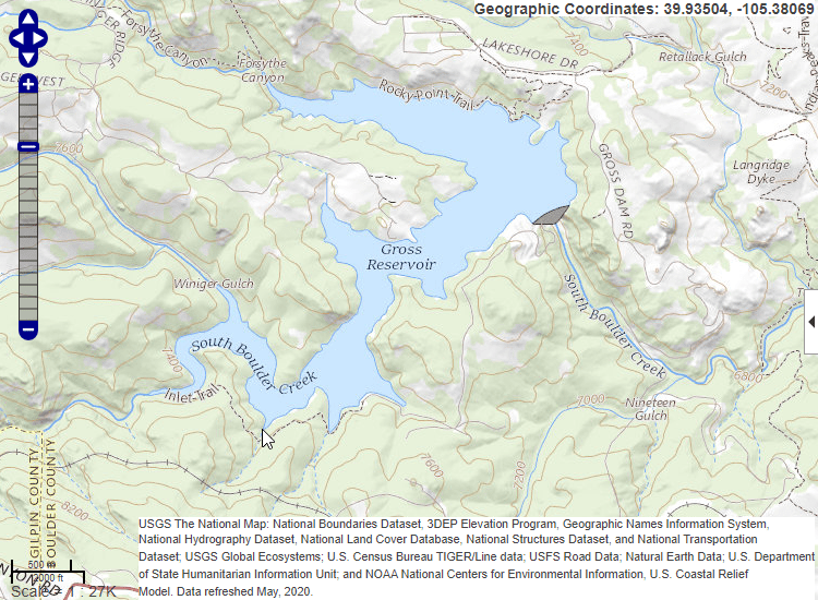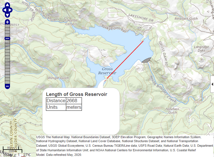 Откройте веб-карту с центром на резервуаре Гросс к западу от Боулдера, штат Колорадо. Используйте тонированную топографическую карту USGS, чтобы получить уровень топографической детализации, необходимый для этого измерения.