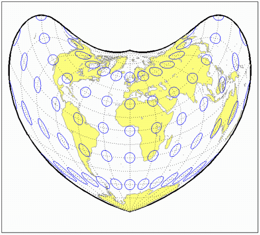 Эта проекция имеет одну стандартную параллель, которая по умолчанию 30ºN. Он имеет две интересные ограничивающие формы. Если в качестве стандартной параллели используется полюс, получается проекция Вернера; если используется экватор, получается синусоидальная проекция.