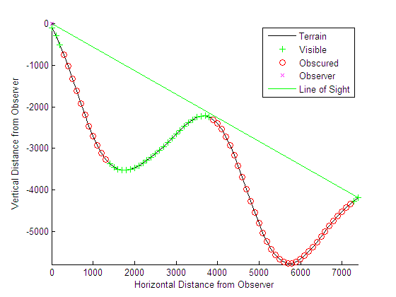 los2 функция создает диаграмму профиля в окне рисунка, показывающую видимость в каждой ячейке сетки вдоль линии визирования, которая может использоваться для интерпретации логического результата. В этом примере диаграмма показывает, что линия между двумя местоположениями едва очищает промежуточный пик.