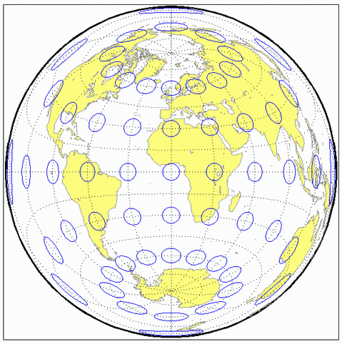 Меридианы: Равноудаленные прямые линии, пересекающиеся на центральном полюсе. Отображаемые углы являются истинными углами между меридианами.