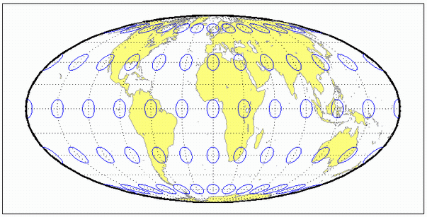 Меридианы: равноудаленные эллиптические кривые, сходящиеся на полюсах.