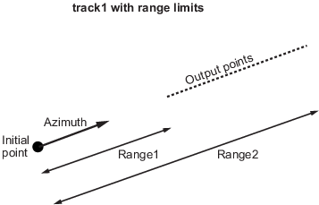 track1 функция также позволяет указать конечные точки диапазона. Например, если требуется, чтобы точки вдоль линии румба начинались на расстоянии 5 ° от начальной точки и заканчивались на расстоянии 13 ° при азимуте 55 °, просто задайте пределы диапазона: