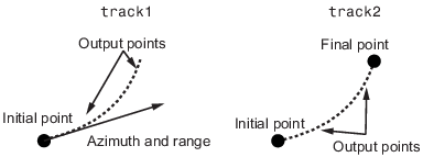 Для рассчитанных дорожек возвращается 100 точек, если не указано иное. Можно вычислить несколько дорожек одновременно, предоставив векторные входные данные. Дополнительные сведения см. в разделе track1 и track2 справочные страницы. Дополнительные сведения о линиях румба см. в разделе Линии румба. Дополнительные сведения о больших кругах см. в разделе Большие круги. Дополнительные вычисления векторного пути описаны в разделе Навигация.