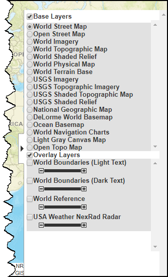 на панели инструментов веб-карты. С помощью Диспетчера слоев можно выбрать слой базовой карты и отобразить слои наложения.