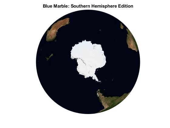 [A, R] = wmsread(modifiedURL); figure axesm globe axis off geoshow(A, R) title('Blue Marble: Southern Hemisphere Edition')