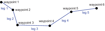Для формата навигационной дорожки требуются переменные «столбец-вектор» для широт и долгот ППМ дорожки. ППМ - это точка, через которую проходит трасса, обычно соответствующая изменению курса (или скорости). Навигационные дорожки состоят из отрезков линий, соединяющих эти ППМ, которые называются ножками. Поэтому в этом формате n ветвей описываются с использованием n + 1 ППМ, поскольку необходимо определить конечную точку конечной ветви. Функции навигации панели инструментов отображения всегда предполагают, что угловые единицы всегда задаются в градусах.
