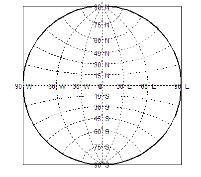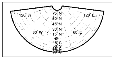 -180 180Стереографическая проекция, будучи азимутальной, не имеет стандартных параллелей, поэтому ни одна не указана. Границы карты не изменяются по сравнению с предыдущей проекцией. Рисунок карты показан ниже.